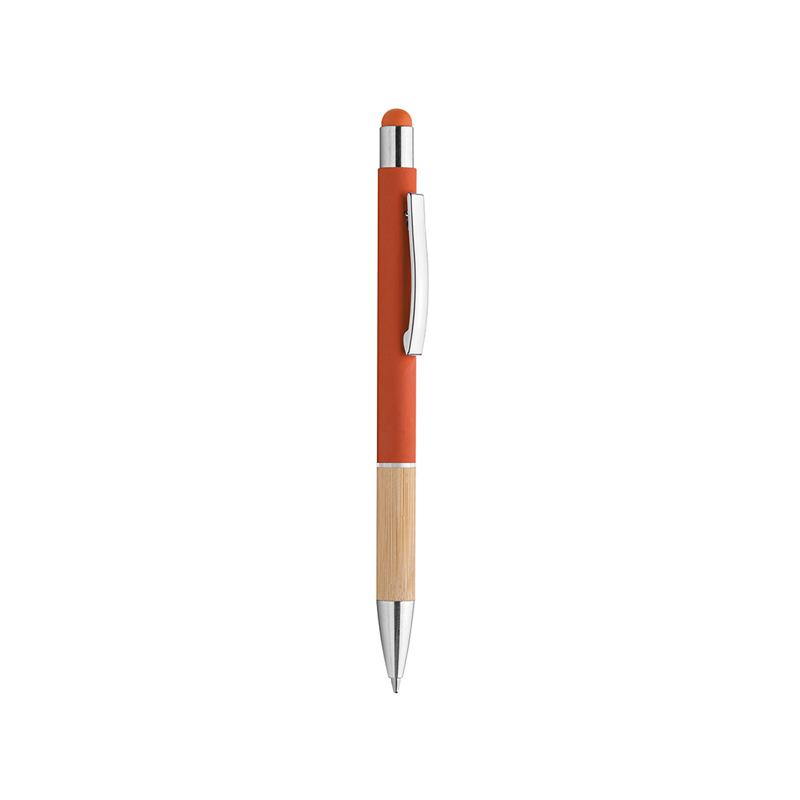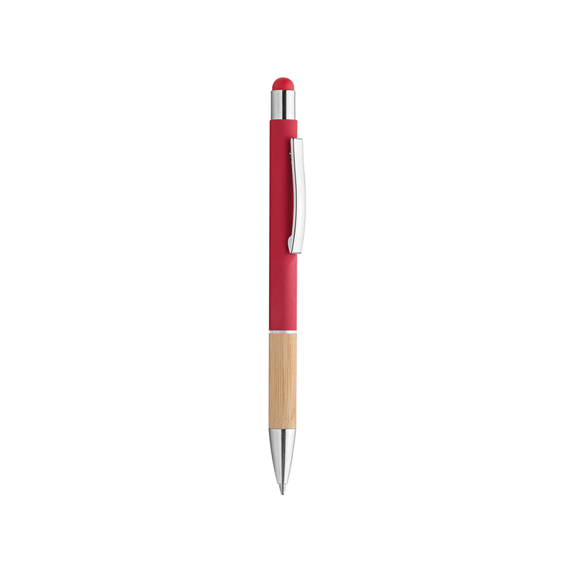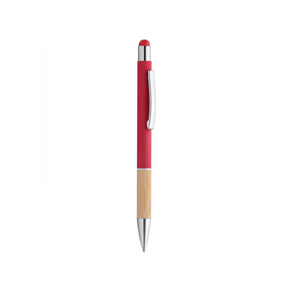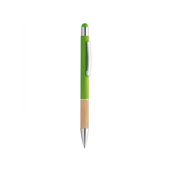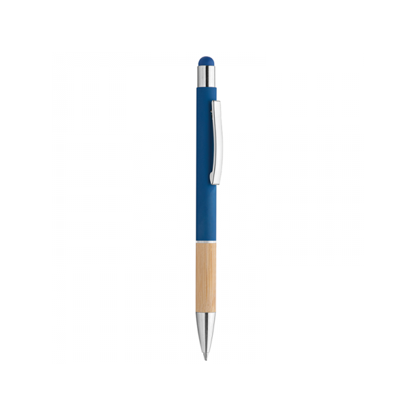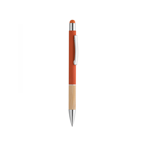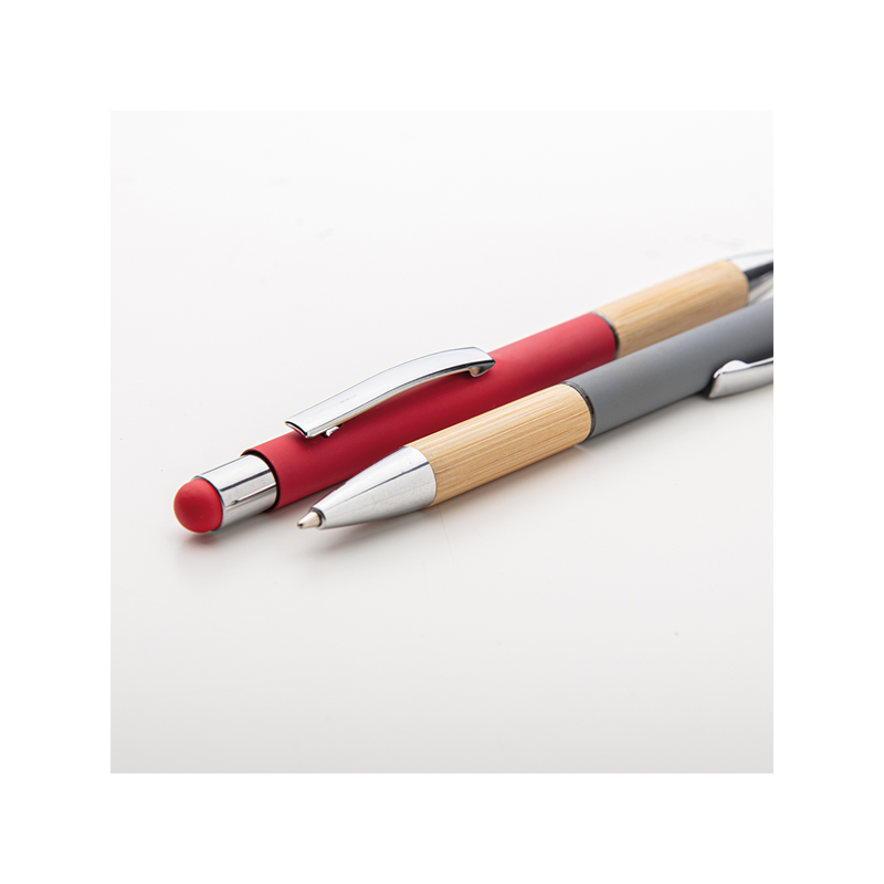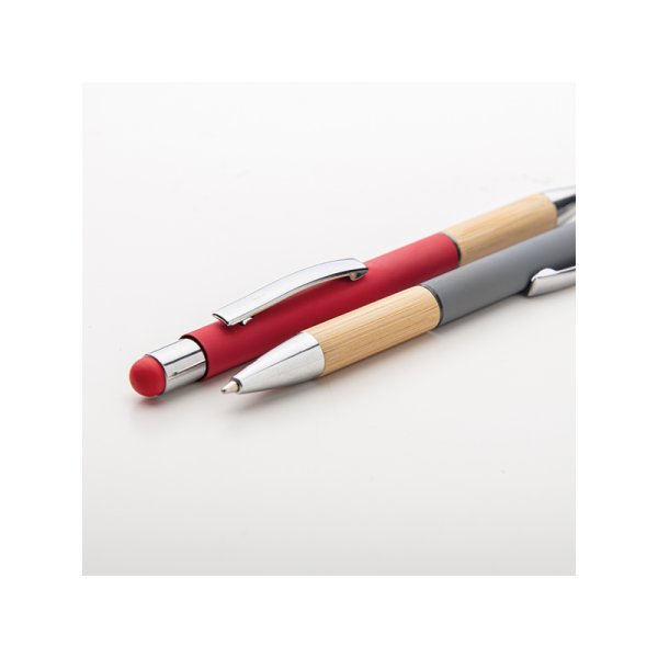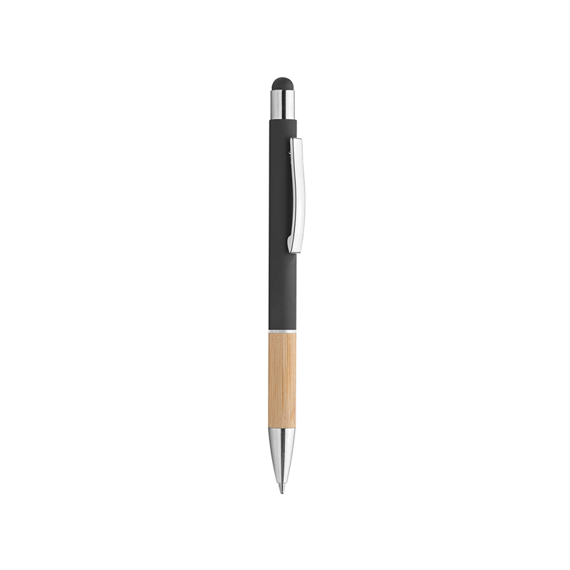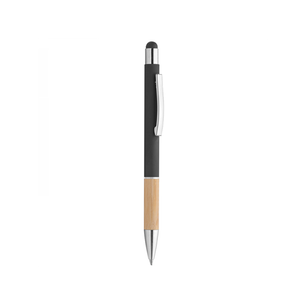 Penna in metallo, fusto in materiale gommato, grip in bamboo, gommino touch, anello trasparente, refill nero, minuterie in metallo cromato