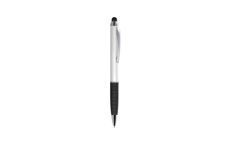 Penna a sfera in plastica, gommino touch, refill nero, meccanismo a rotazione, grip in gomma