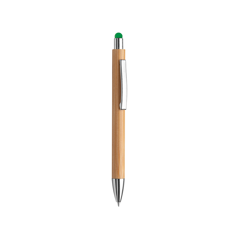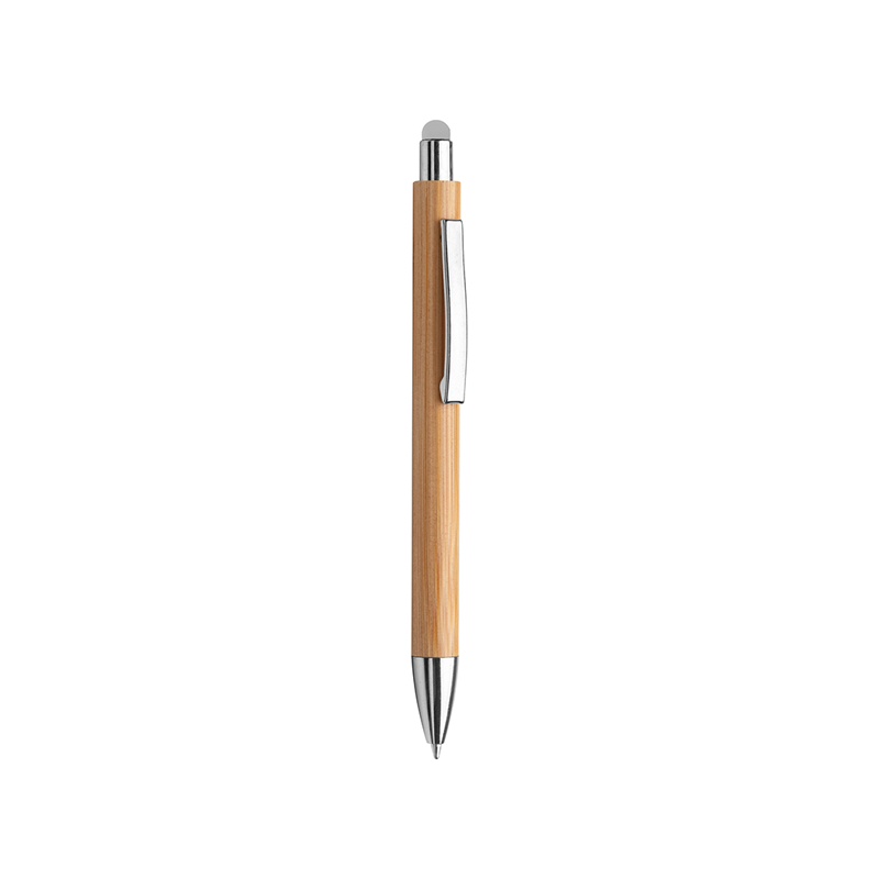Penna in bamboo, refill nero, minuterie in metallo cromato, gommino per touch screen