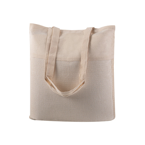 Borsa shopping in cotone, trama a rete, manici lunghi, colore naturale, rifiniture cucite, banda superiore personalizzabile.