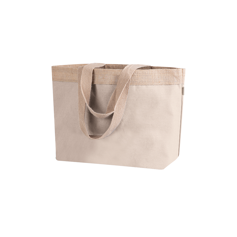 Shopper in cotone laminato e juta, manici lunghi, soffietto, 220 gr