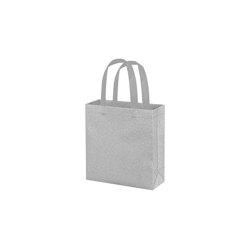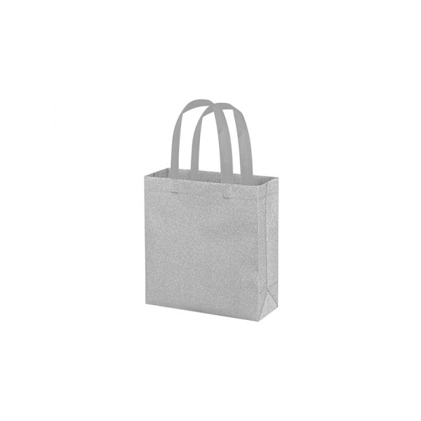 borsa shopping TNT glitter, soffietto, manici corti, rifiniture termosaldate, colori glitterati.