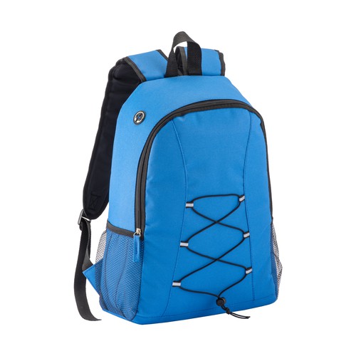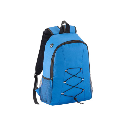 Zaino in poliestere 600D con uscita per cuffie. Stringhe elastiche esterne e 2 tasche laterali in rete. Schienale e spallacci imbottiti