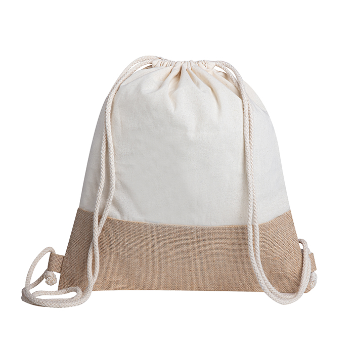 Sacca zaino in cotone e juta, doppia corda di chiusura, rifiniture cucite.